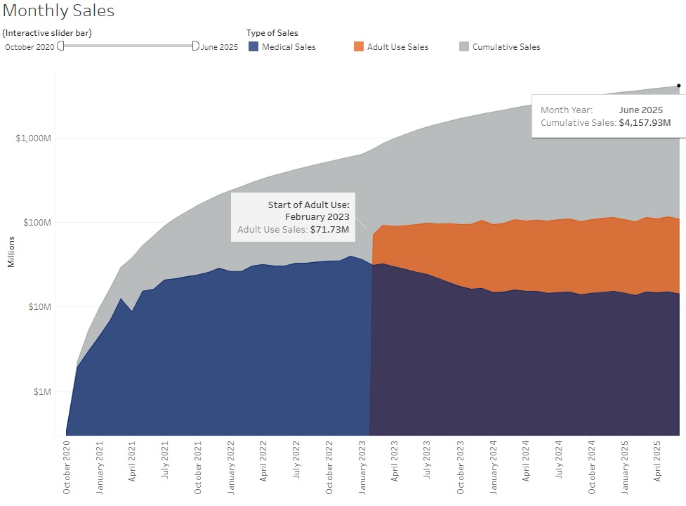 Recreational cannabis sales totaled $110.6 million in June 2025, which was about $7 million less in total adult-use sales in Missouri compared to the previous month. Medical cannabis sales for June 2025 in Missouri totaled about $14.5 million, which was also a decrease compared to May 2025 by about $1 million. Below is a graph of monthly sales totals from Missouri: